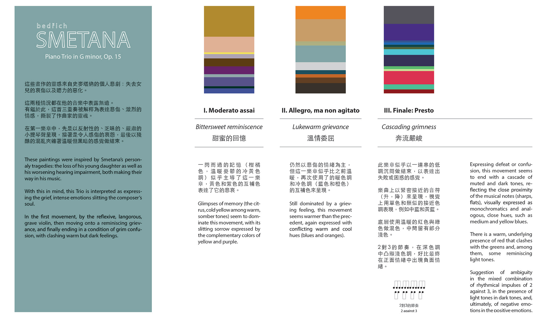 Paintings and scarf design inspired by a classical concert of Piano Trios by B.Smetana and L.v.Beethoven performed at xxx, in Yunlin city, Taiwan. The scarves are 145x110cm digitally printed on a soft polyester fabric.