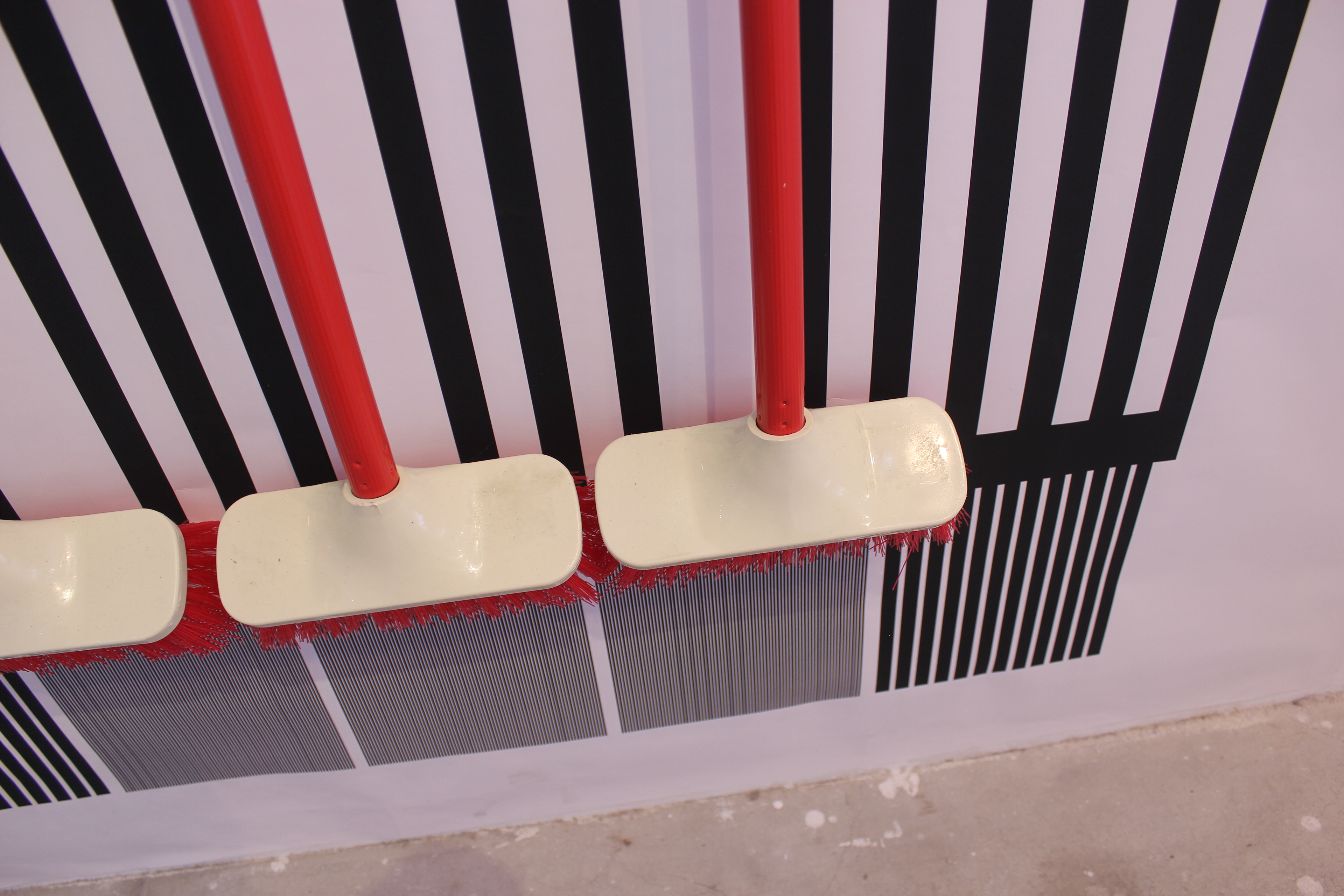 The work "Hidden Shapes" has forms that invite us to fit the object within, while "How big is everything (III)" dissects a sweeper into its component parts, embodying it in a bi dimensional surface, so that the image is completed when the objects and its representation are shown together.